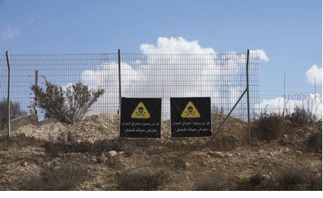 Batı Şeria'daki Dahiriye şehrinin çeperlerinde, "Bariyeri aşmaya çalışan herkes hayatını tehlikeye atacaktır" uyarı levhası bulunan Ayrım Duvarı’nın bir bölümü, 18 Eylül 2024. (AP Fotoğrafı/Mahmoud Illean)