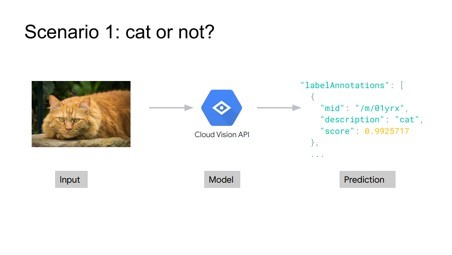Görsel 5’te Google’ın sağladığı Cloud Vision API aracı tanıtılıyor. Daha önceden birçok kedi görseli gösterilerek eğitilmiş olan yapay zekâ modülüne bir görsel gösterilip bunun kedi olup olmadığı soruluyor. Yapay zekâ ise 0 ile 1 arasında bir skor veriyor. Görsel 5’te gösterilen kedi için yapay zekâ 0.9925717 skorunu veriyor.[15]