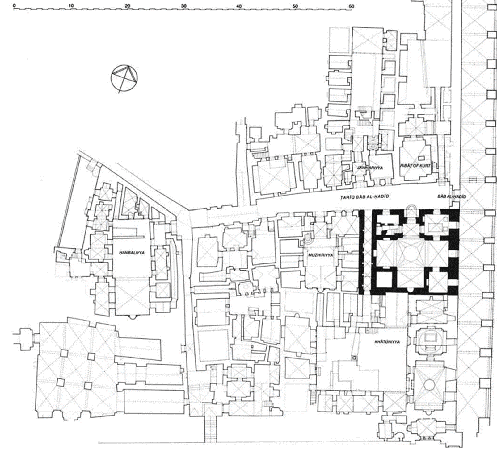 Medrese, Mescid-i Aksa’nın batısında, Demir Kapı’ya (Babül Hadid) yakın bir konumda yer almaktadır. İki katlı olarak inşa edilmiş olan yapı, Mescid-i Aksa avlusunda yer alan en görkemli yapılardan bir tanesidir. Medresenin girişinin yer aldığı duvarın bir kısmı iki renk taştan örülmüştür. Girişin üzerinde yer alan oyma taşta medresenin banisinin ismi ile inşa tarihi bulunmaktadır (Uğurluel, 2022; Erguvan Medresesi, 2024). Kitabe sokak cephesinde bulunan taç kapının sövesinde yer almaktadır. Kitabenin iki yanında madalyon şeklinde peşkir arma bulunmaktadır. Eşkenar dörtgen formunda bulunan arma, yaptıran kişinin devlet içerisindeki konumunu göstermesi bakımından önemlidir (Burgoyne & Richards, 1987).